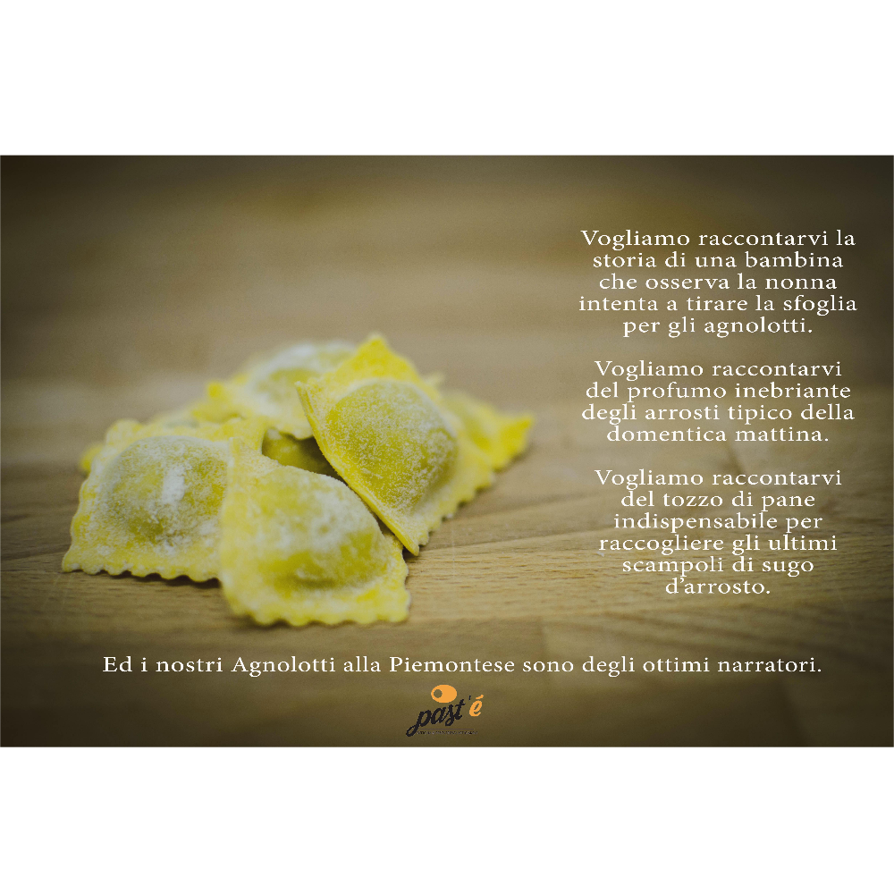Agnolotti prodotti con sole materie prime fresche senza aggiunta di conservanti, coloranti o additivi. Carni bovine e suine derivanti da capi di bestiame nati in Italia ed allevati in Piemonte.