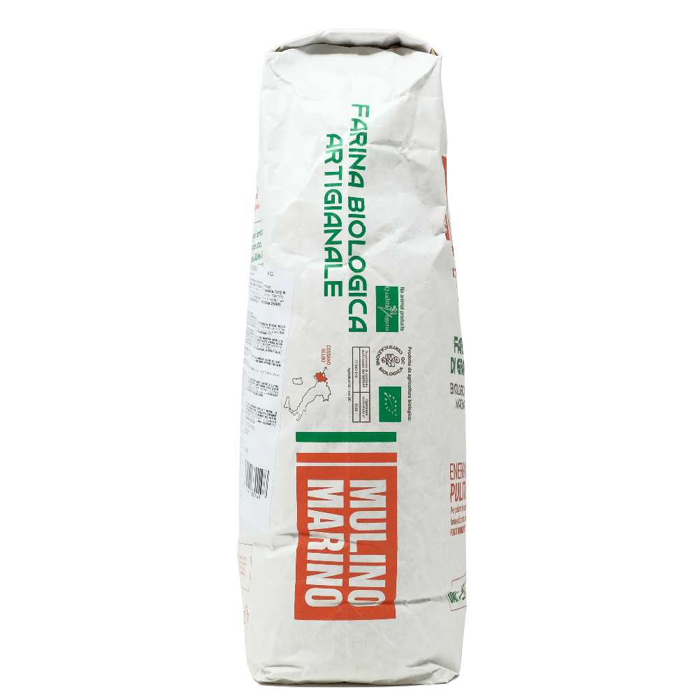 farina biologica ottenuta dalla macinazione a cilindri ad ampia superficie (e quindi poco raffinata) di un miscuglio di grano tenero biologico coltivato in Italia