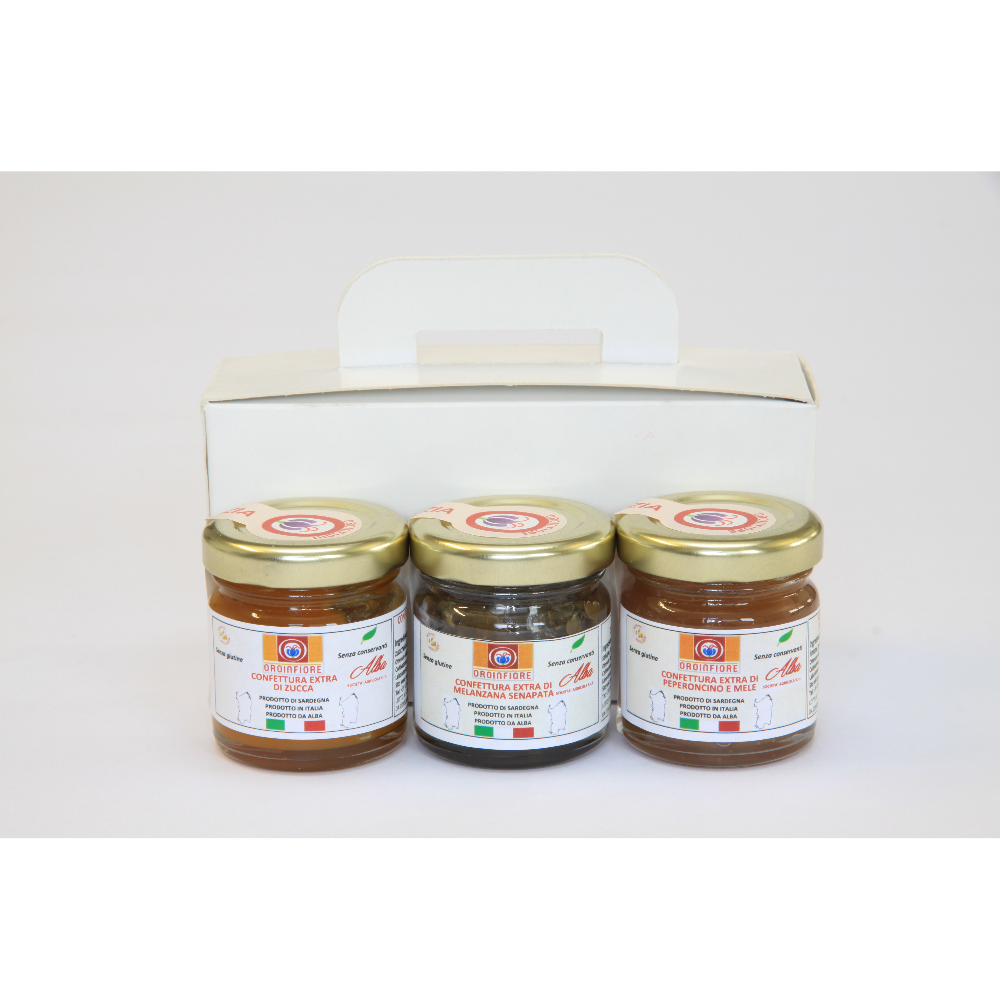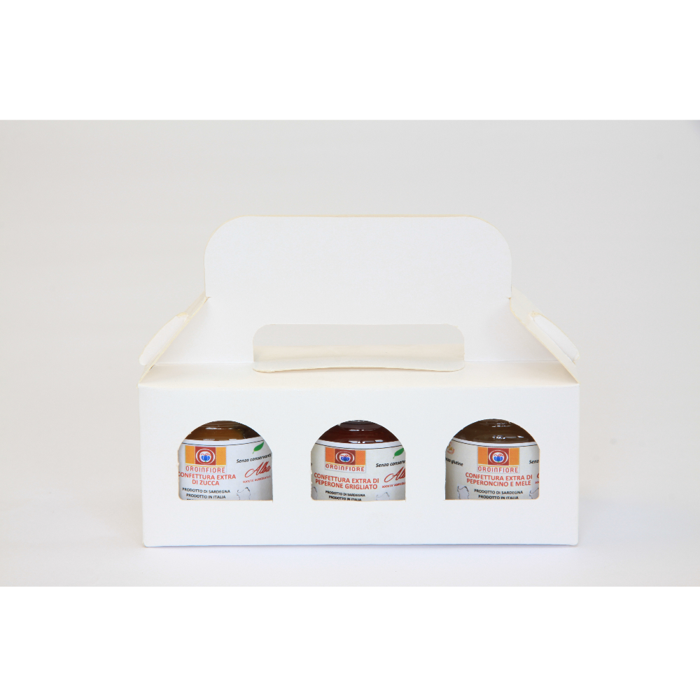 Tris di confetture di verdure confezionati in pratico cartoncino con maniglia.