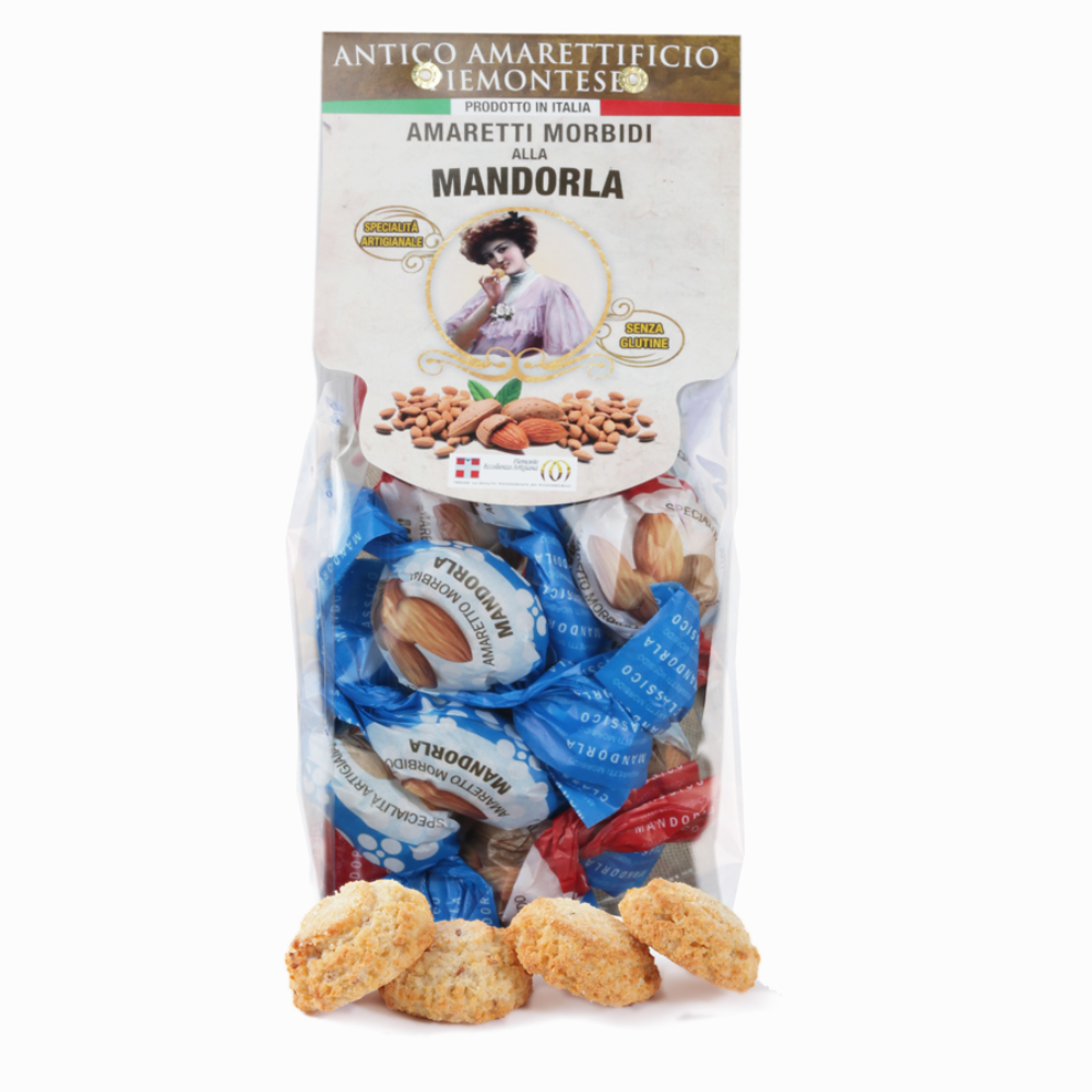 Amaretto morbido a base di mandorle e miele. Prodotto secondo l'antica ricetta piemontese senza glutine. Una dolce coccola, ideale come fine pasto o dolcetto da meditazione.