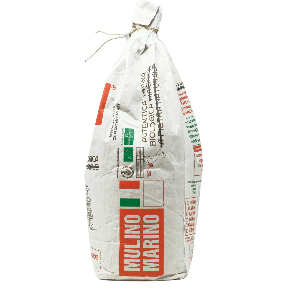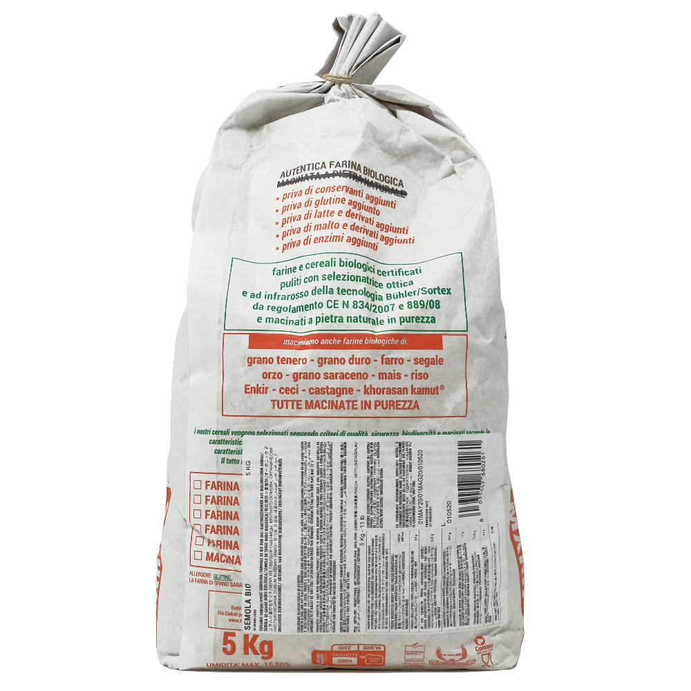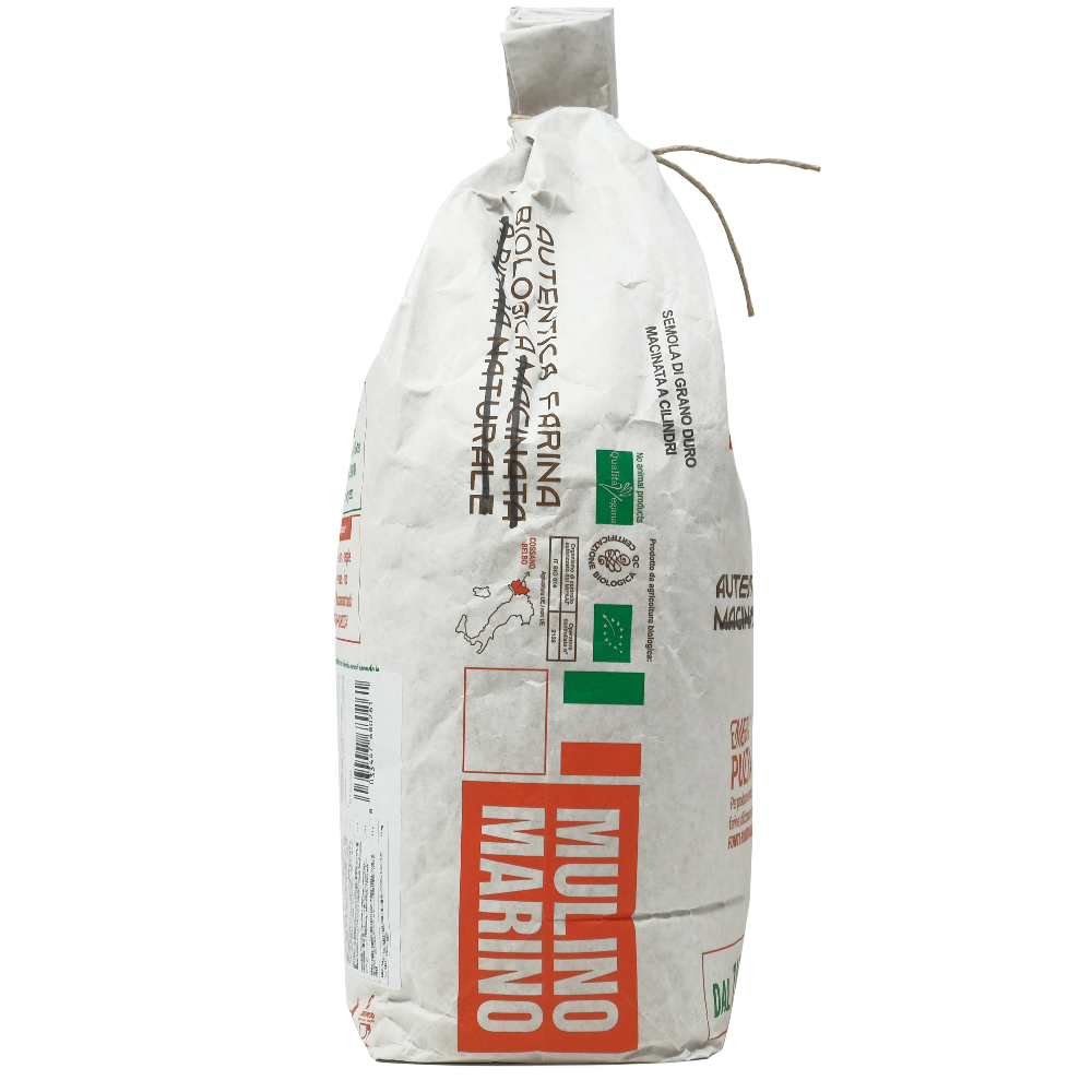 farina biologica ottenuta dalla macinazione a cilindri ad ampia superficie (e quindi poco raffinata) di un miscuglio di grano duro biologico coltivato in Italia