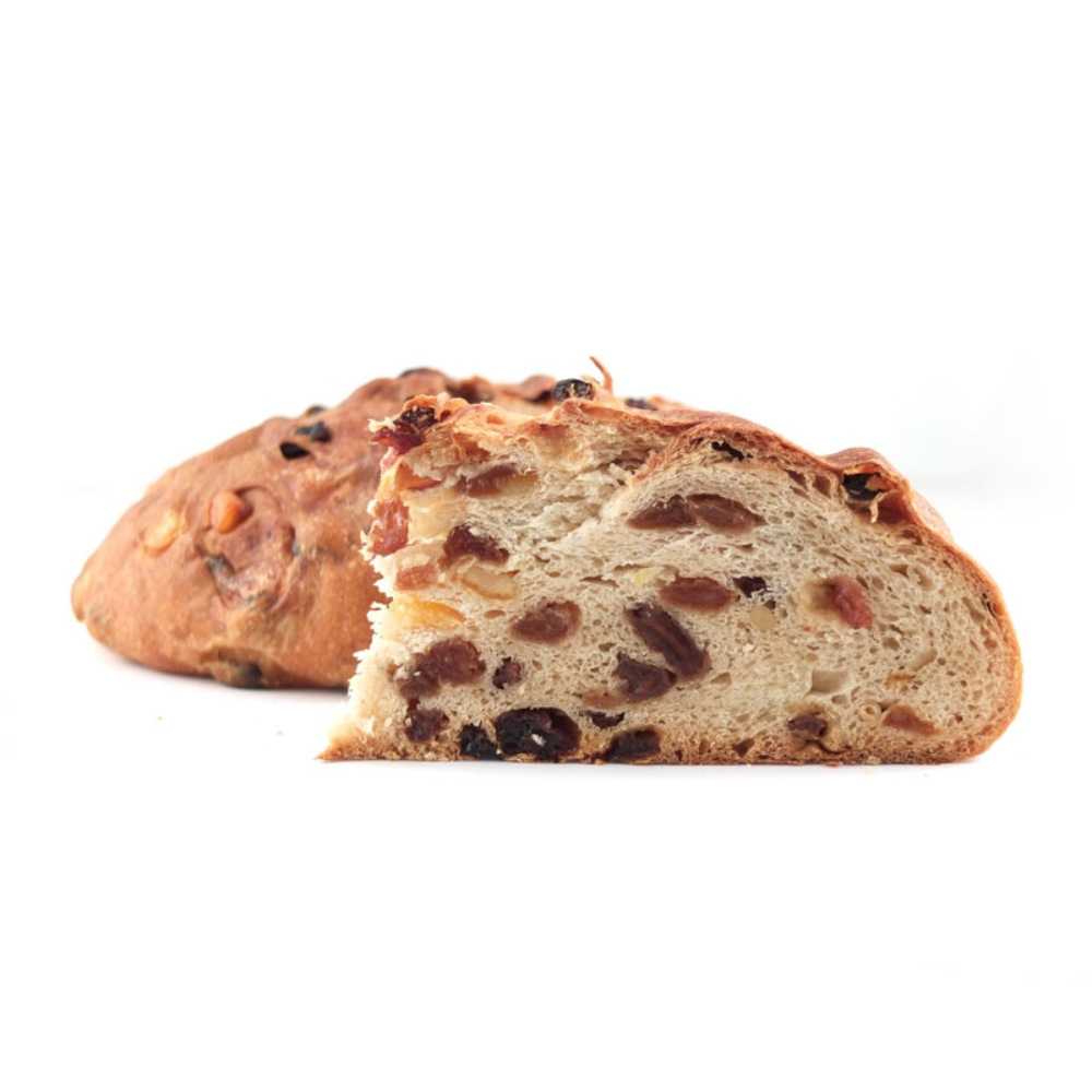 Farina tipo 0, BURRO, uva sultanina, zucchero, LATTE, UOVA, macedonia di frutta, pinoli, lievito.