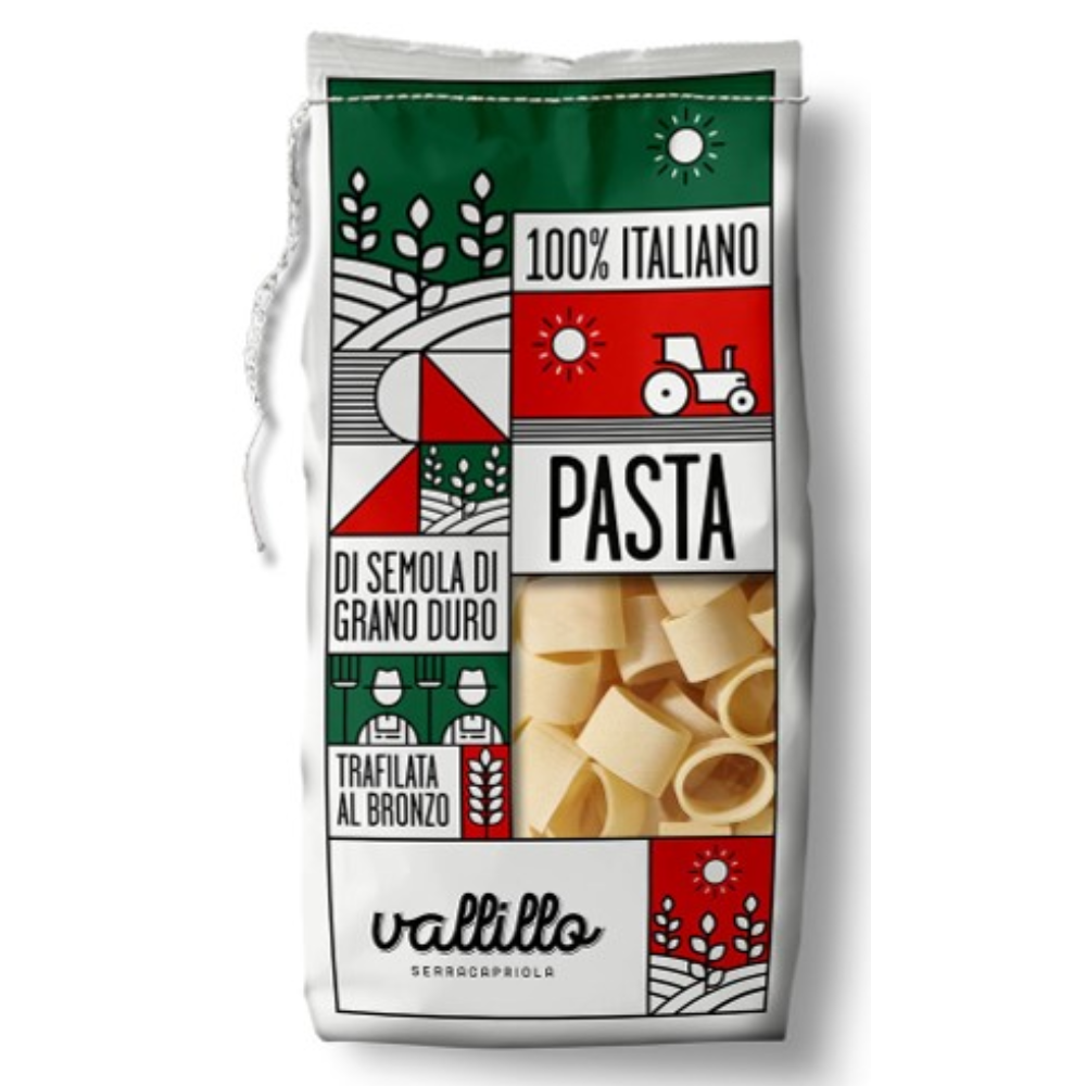 Solo grani ad alto contenuto proteico, coltivati su più di 500 ettari dell’agro di Serracapriola in Puglia, dove il clima mite tra mare e montagna ed il sole del mediterraneo consentono di rispettare la naturale maturazione della spiga. Questo permette di ottenere una semola di assoluta qualità per realizzare una pasta 100% italiana priva di tossine (glisofato, cadmio e don). Il festival dell’abbondanza per questi grandi cilindri, di dimensione spregiudicata e immensa forza comunicativa. La spettacolare tenuta in cottura e il morso pieno sono una vera gioia per i sughi che li incontrano.