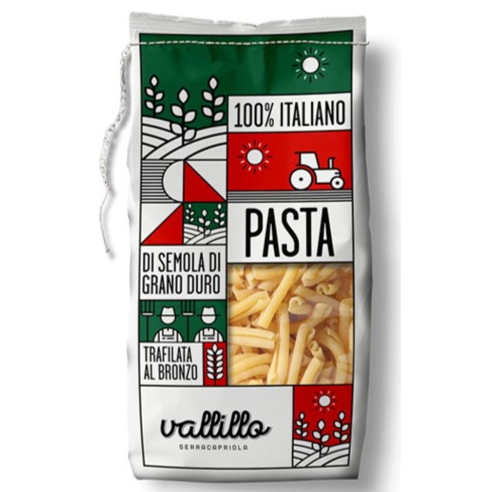 Solo grani ad alto contenuto proteico, coltivati su più di 500 ettari dell’agro di Serracapriola in Puglia, dove il clima mite tra mare e montagna ed il sole del mediterraneo consentono di rispettare la naturale maturazione della spiga. Questo permette di ottenere una semola di assoluta qualità per realizzare una pasta 100% italiana priva di tossine (glisofato, cadmio e don). La particolare forma di questa pasta e la purezza cristallina della semola Vallillo sono il perfetto contraltare di condimenti importanti, mousse, salse dense, accolti e coccolati in un abbraccio seducente.