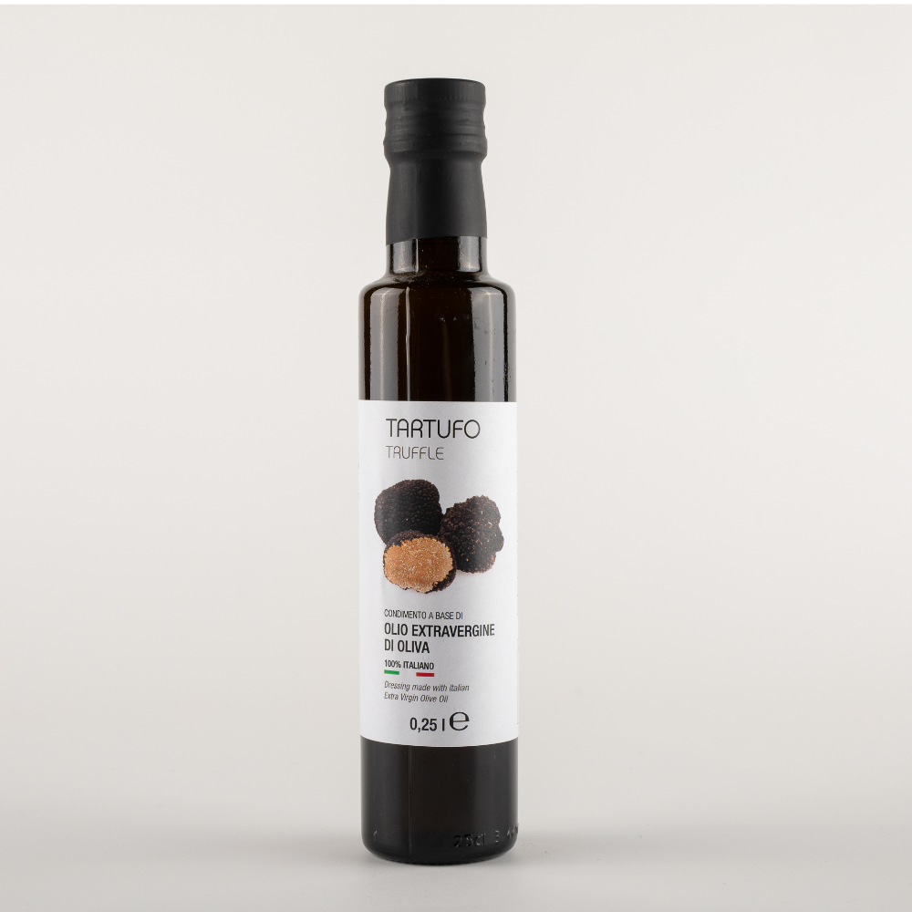Olio Extravergine al TARTUFO È a base di tartufi freschi moliti con olive appena raccolte. Consigliato per bruschette, pasta all’uovo, risotto, carpaccio, uova, tagliate di carne.