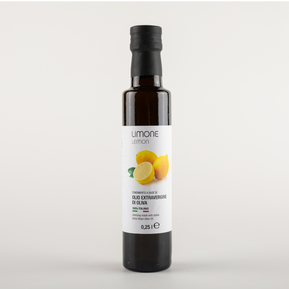 Olio al Limone È a base di Limoni freschi moliti insieme alle olive appena raccolte. Consigliato per insalate, verdure, carpacci, pesce crudo o affumicato, crostacei, carni bianche, pasticceria.